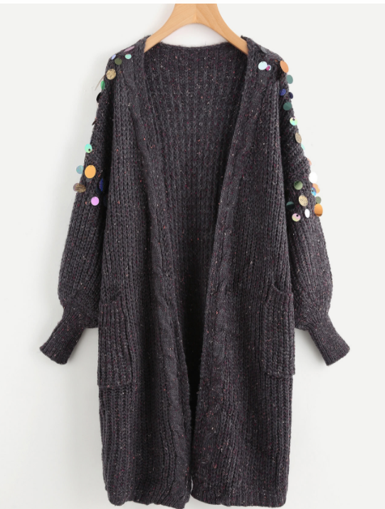 Siguiendo en la línea de prendas de punto os muestro este cardigan en gris oscuro, también muy amplio, que como detalle que le hace diferente original y especial tiene unos apliques de lentejuelas muy grandes que le dan ese aire sofisticado y chic que tanto nos gusta a las mujeres. Nuevamente se me ocurren infinidad de combinaciones, con blusas, camisetas, botines planos de tachas (que además son super tendencia esta temporada) con vestidos y botas overtheknee....