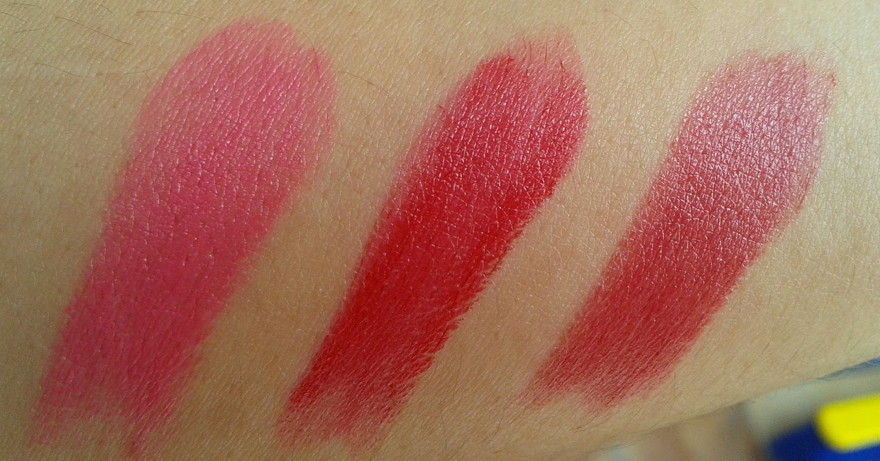 Como podéis comprobar tienen una pigmentación estupenda y unos colores muy favorecedores. Su textura es muy cremosa y cubriente. En cuanto a la duración, es bastante buena, comí, bebí, y ahí seguía el color, eso sí, un poco más difuminado. Me sorprende bastante la calidad de estos labiales para lo baratitos que son. La única pega es que con el paso de las horas, aunque se va manteniendo el color, el labio se va notando un poco más seco. Pero eso es todo.