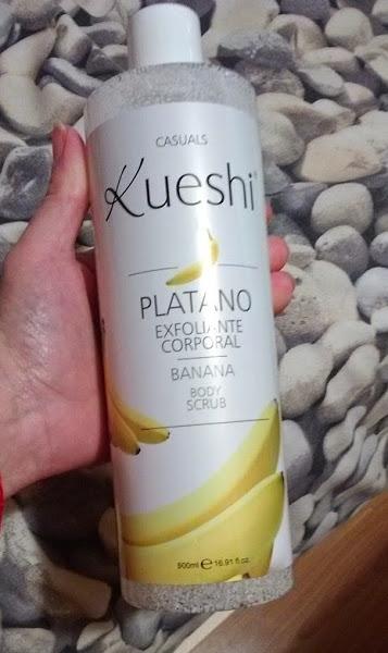 -Exfoliante de cuerpo Kueshi: Este es uno de los exfoliantes más grandes que he probado ya que el bote contiene 500 ml. Huele divino a banana!!! Dan ganas de comérselo! Ja ja ja! Tiene una textura tipo gel muy ligera y transparente en la que se pueden ver unas bolitas blancas que en un principio son las que ejercen la exfoliación de la piel. Lo bueno es que es un gustazo usarlo por lo bien que huele, pero también porque te deja la piel muy suave y no rasca ni irrita. Me encanta1 Si no me equivoco me costó unos 7 euros en oferta. Un producto que os recomiendo probar porque es pura delicia.