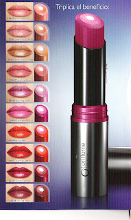 6-BARRA DE LABIOS TRIPLE NÚCLEO DE ORIFLAME:esta barra salió como novedad hace unos catálogos y me llamó la atención porque era diferente a las demás ya que tiene tres capas diferentes en la misma barra. Una de las capas es transparente y te hidrata los labios, la otra da un color muy bonito y la tercera le proporciona brillo. Es una barra muy cremosa y cubriente con unos colores preciosos y que no reseca los labios. Aproveché que estaba de oferta a 8,95 euros y estoy encantada con ella. Yo tengo el tono "Stunning clover". Os dejo foto de catálogo para que veáis los colores que hay y luego os dejo foto de como me queda una vez aplicada.