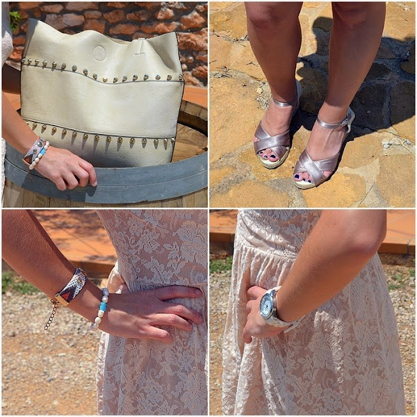 Como teníamos que ir a un pueblecito de montaña,visitar la bodega, ver la finca, caminar por lo viñedos y demás...opté por un look cómodo y fresquito. Elegí un vestido en color rosa palo de encaje con detalle abierto en la espalda, es de Zara del año pasado, pero ya sabéis me gusta mucho reutilizar prendas de otros años en verano. Elegí unas cuñas y un maxibolso para poder llevar de todo!
