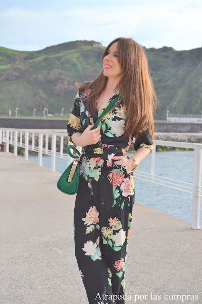 Los monos se han vuelto imprescindibles para mi, son estilosos, cómodos y se adaptan a todas las tendencias temporada tras temporada y esta primavera vuelven a ser una de las prendas protagonistas. Hoy os enseño un look con un mono de estampado floral e inspiración oriental super cómodo y fresquito y además perfecto para un look formal, como es éste, pero también para un look más casual ya que con mocasines queda ideal (os lo enseñaré en otro look). Como veis lo combiné con zapato de tacón negro y un bolso verde con cierre de boquilla a juego con las flores y que sirve tanto para llevar de bandolera como de mano. Qué os parece el look?