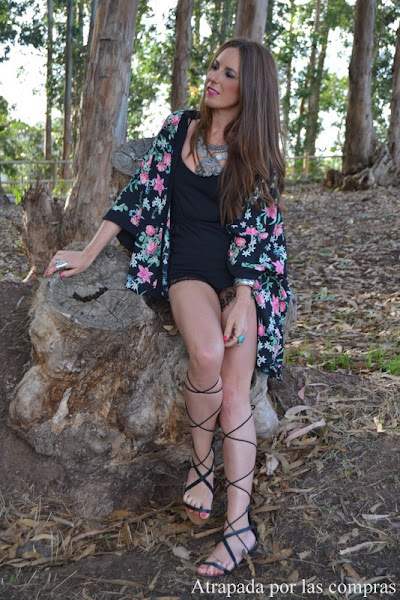 Los monos y los kimonos se han convertido en mis prendas favoritas para el verano, hoy os traigo un look muy especial y de estilo boho con un mono lencero y un kimono de flores, un total look en negro con la salvedad de las flores del kimono que aportan algo de colorido. Para el calzado opté por sandalias romanas y el toque fundamental del look, gran parte de la la bisutería boho que me ido comprando este verano. Como se trata de un look algo especial quise hacer unas fotos un poco diferentes sobre todo por el lugar escogido, espero que os guste el resultado.