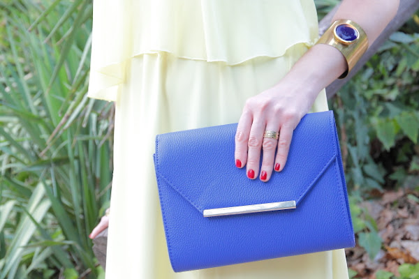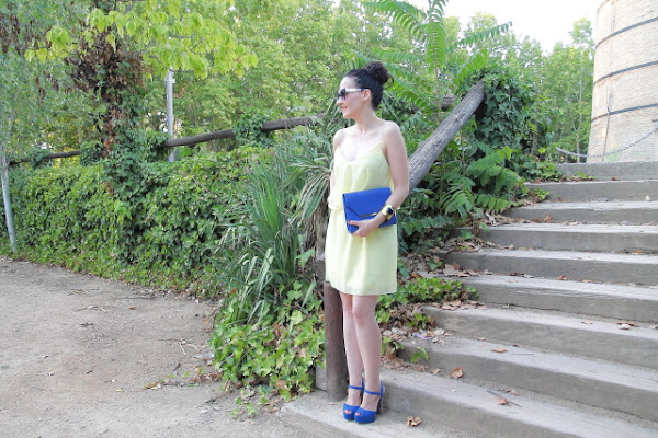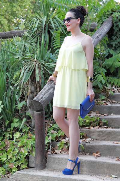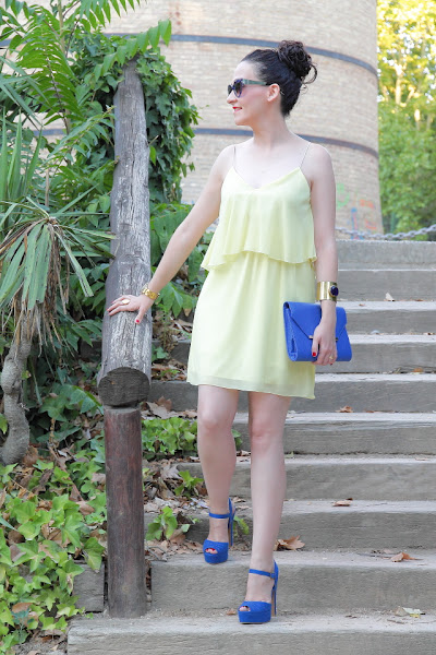 Durante mis vacaciones aproveché para dar una vuelta por uno de los típicos mercadillos que hacen por mi zona. Normalmente no suelo ir porque siempre que los hacen estoy trabajando, así que este día no lo dudé y nos fuimos con mi madre a ver que veíamos. La verdad es que no valía mucho la pena excepto por un pequeño puesto que tenía cositas super monas. Este vestido de gasa con volante en el pecho me lo compré allí, nada más llegar lo vi, solo en una esquinita, vamos que parecía que me estaba esperando. Siempre me ha parecido que el amarillo y el azul klein hacen un combo perfecto, así que hoy me he decantado por llevarlo con clutch y sandalias de tacón en este tono.