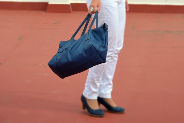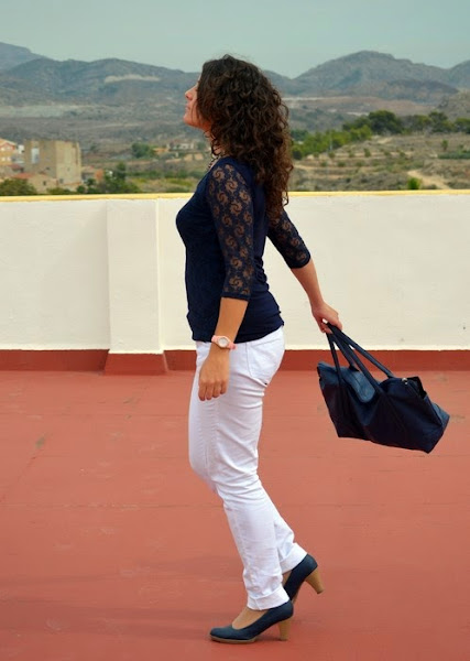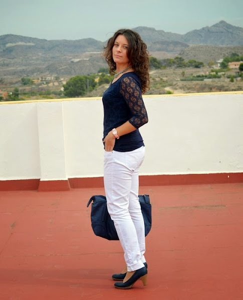 Hoy os muestro en este post mi lado más natural haciendo una sesión de fotos. Cuando hacemos los shootings, a parte de que las fotos queden "decentes", lo importante es disfrutarlo y pasarlo bien. Desde que he vuelto de Peñiscola entre el trabajo, la mudanza, organizar papeles, cambiar el armario y un montón de cosas más no he tenido tiempo de hacerme fotos. El outfit de hoy se corresponde con el look de ayer domingo para volver a casa antes de coger el tren desde Alicante. Fue una sesión express en 5 minutos, y en las fotos me muestro tal y como soy, seria a veces y dando vueltas como una niña en otras. El look que elegí fueron unos pantalones blancos con una camiseta de manga francesa en azul marino con detalle de encaje, un look muy básico y buscando la comodidad ante todo (me esperaban casi 3 horas de tren sentada).