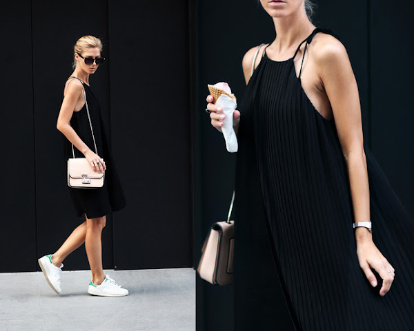 Vestidos con deportivas en lugar de sandalias y cazadora vaquera...