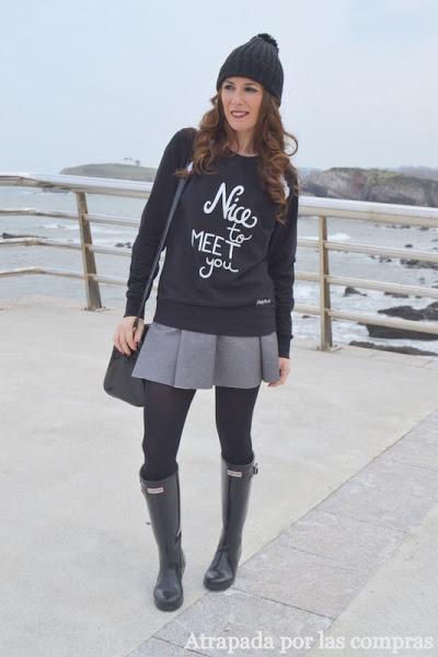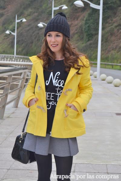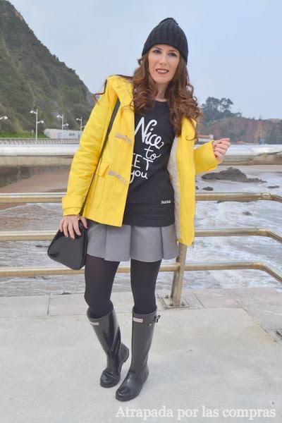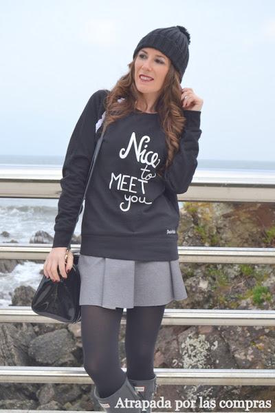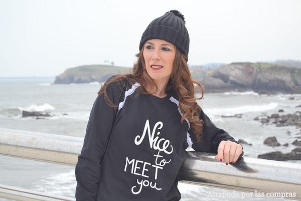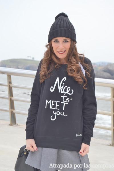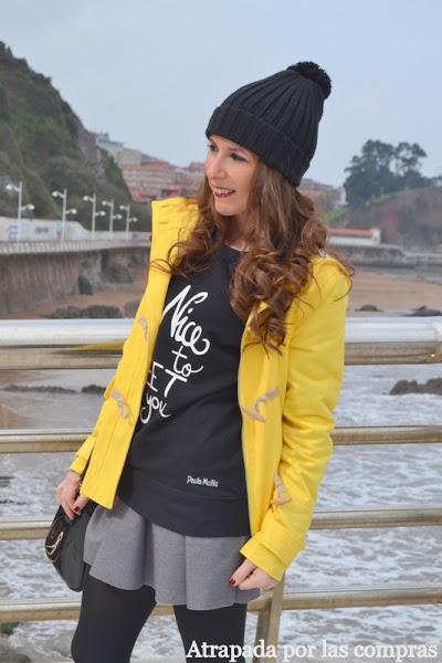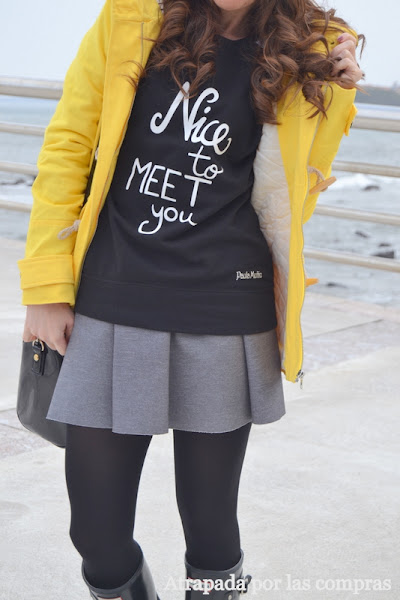 NICE TO MEET YOU, eso es lo que dice mi sudadera del look de hoy, ya sabéis que las camisetas y sudaderas con mensaje me encantan además de estar de super tendencia y esta sudadera de la diseñadora asturiana PAULA MUÑIZ me pareció fantástica, porque es verdad, estoy encantada de haber conocido a muchas personas que he conocido gracias al blog, entre ellas a Paula. PAULA MUÑIZ es una diseñadora asturiana, de Pola de Siero, que comenzó a diseñar de forma experimental en el 2006 y poco a poco se ha ido consolidando y haciendo un nombre dentro de la moda asturiana con diseños originales y funcionales para el día a día. Hoy combino una de sus prendas en un look cómodo para un día de lluvia con lo que he llamado mi "Capitán Pescanova", sin duda fue ver esta trenka amarilla de Stradivarius y enamorarme de ella, me pareció una prenda perfecta para la primavera tanto por la tela, el detalle de los botones, como por el color, el amarillo, que va a ser uno de los colores tendencia de la próxima temporada. Qué os parece el look?