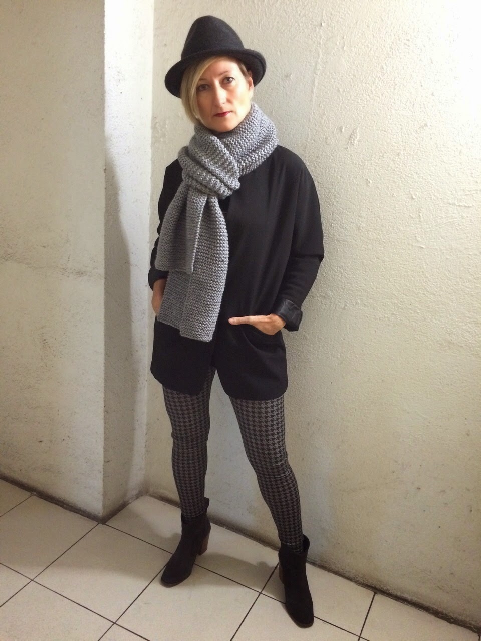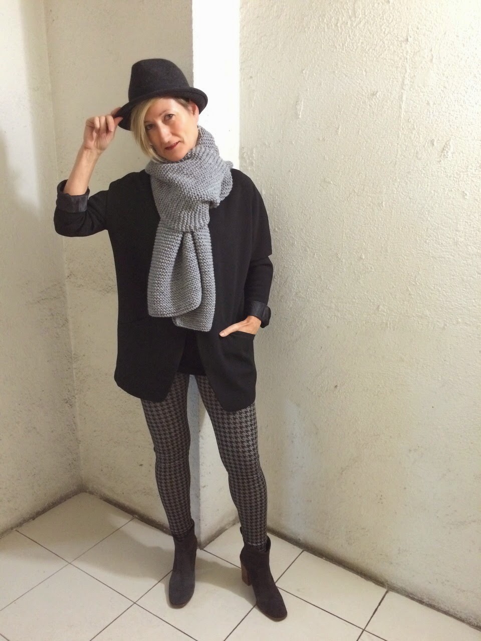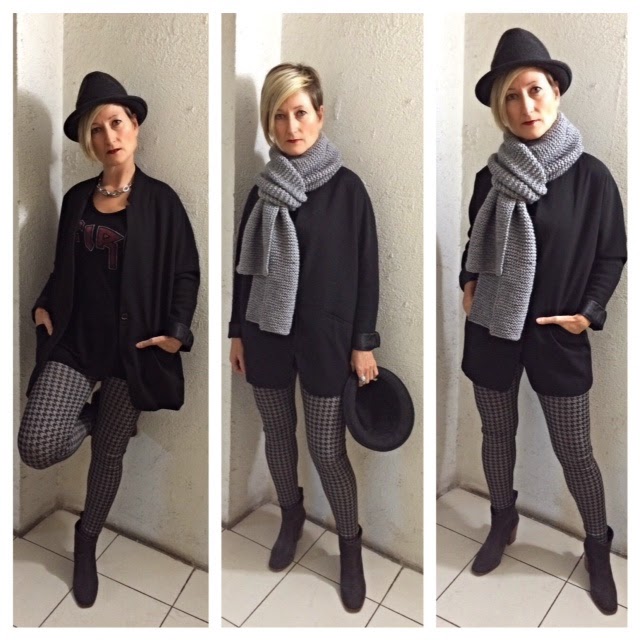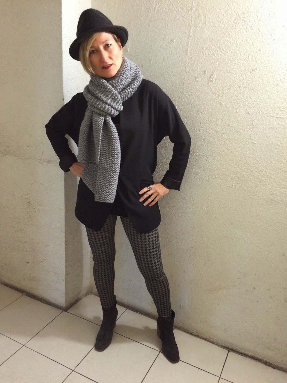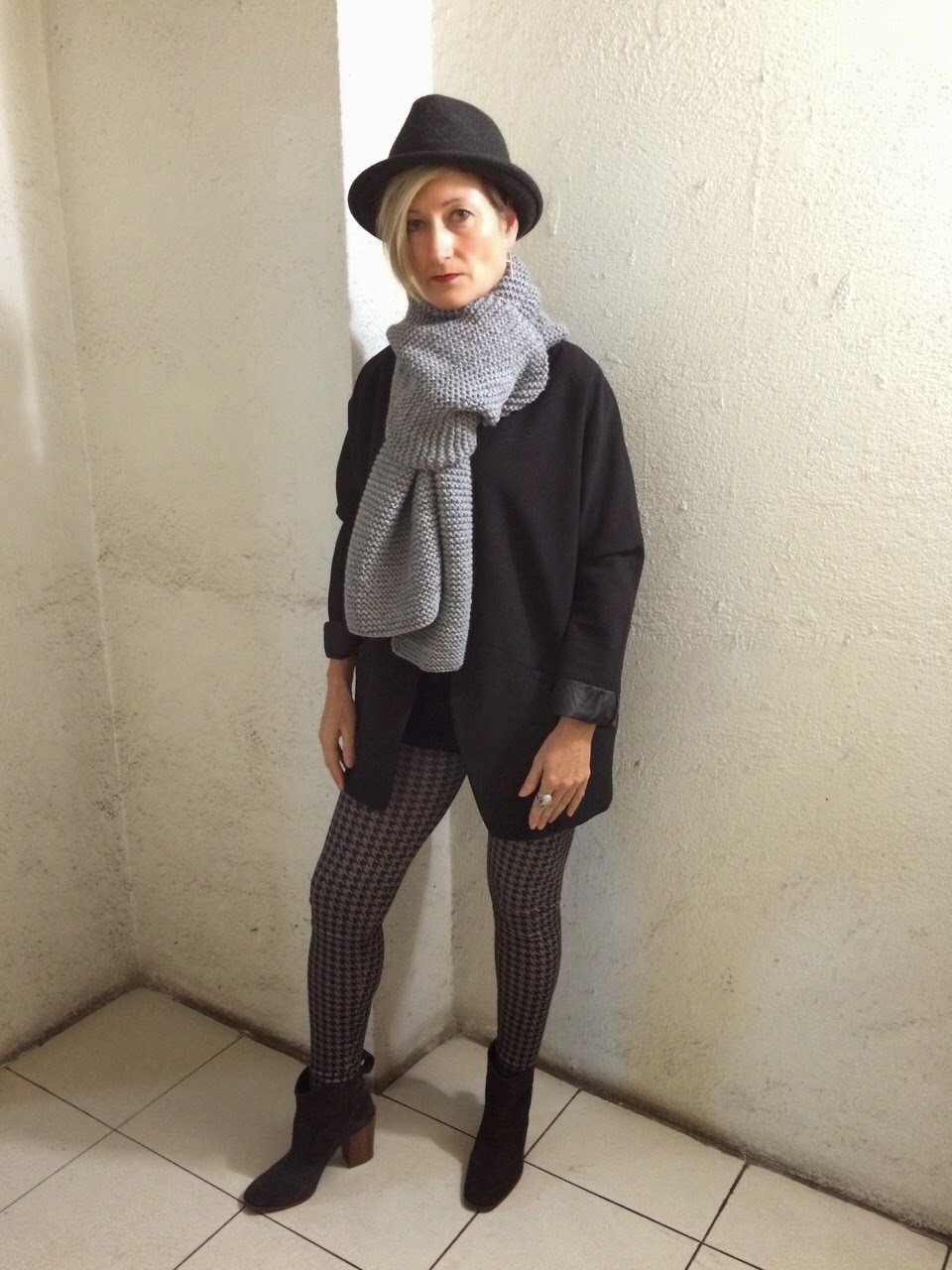Un look en tonos grises y negro, roto sólamente, por el rojo del mensaje de la camiseta y el estampado de pata de gallo de los leggins. Muy masculino quizá, pero me gustaba el resultado.