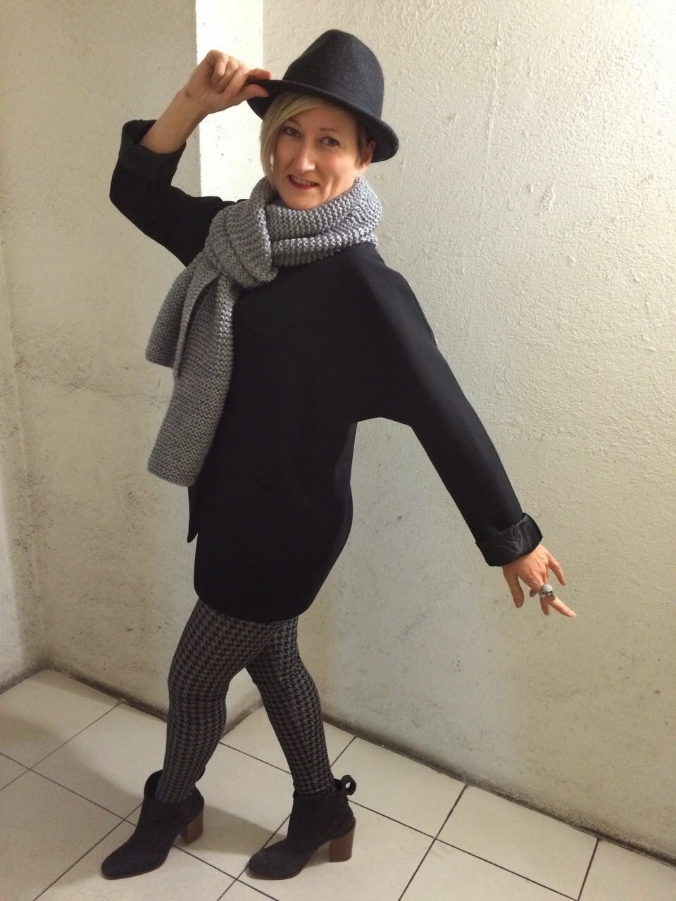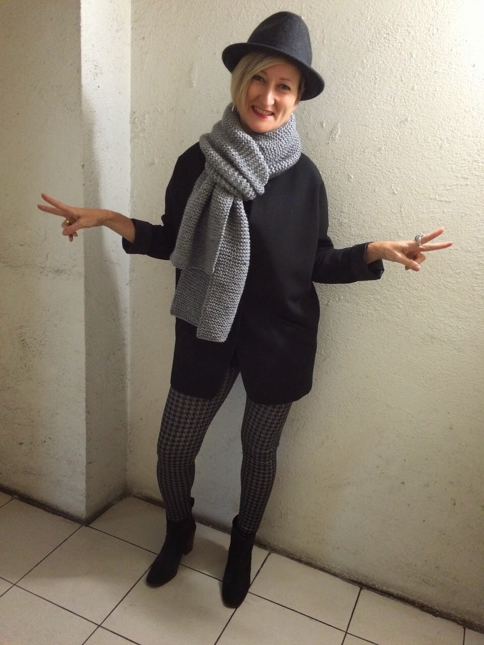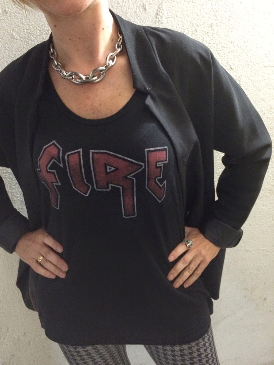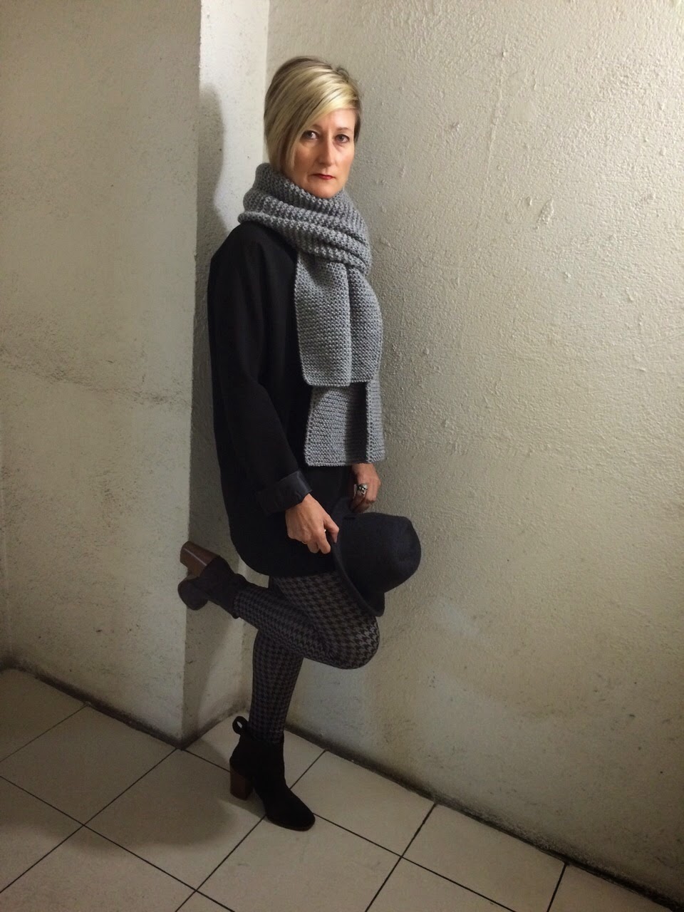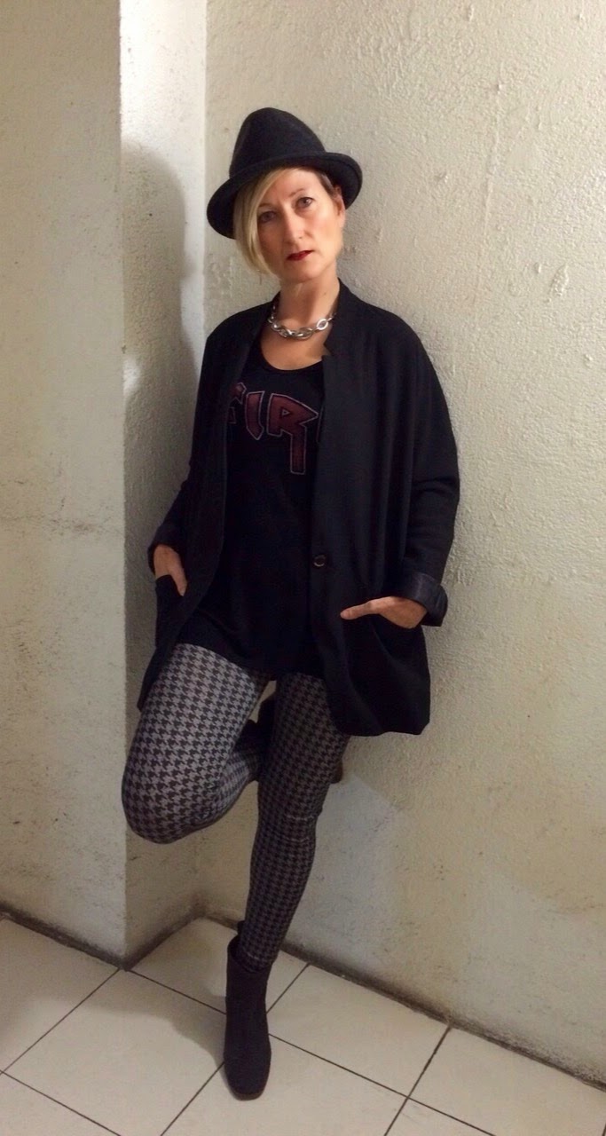 Un look en tonos grises y negro, roto sólamente, por el rojo del mensaje de la camiseta y el estampado de pata de gallo de los leggins. Muy masculino quizá, pero me gustaba el resultado.