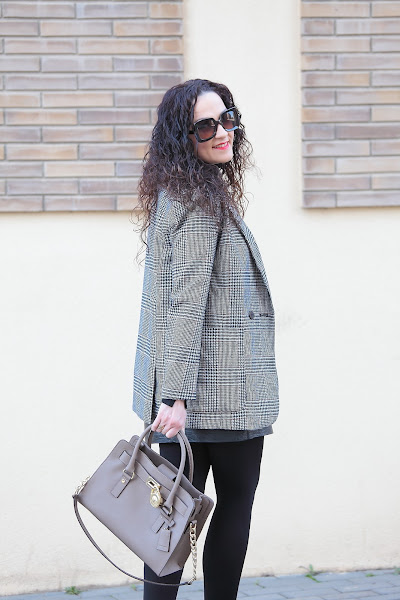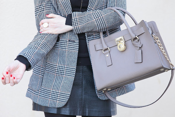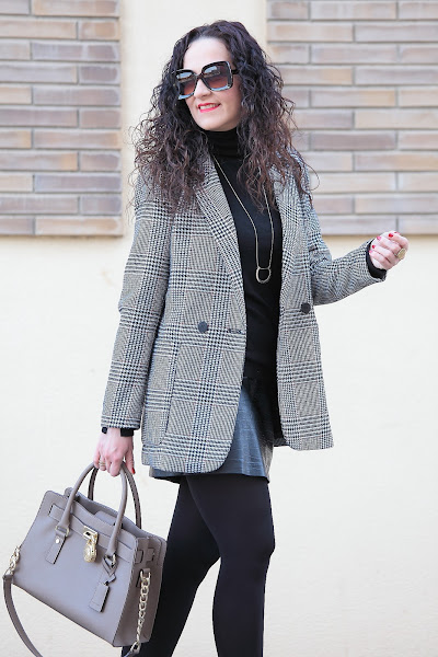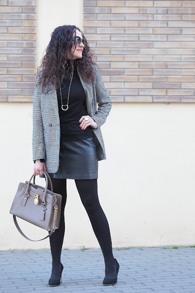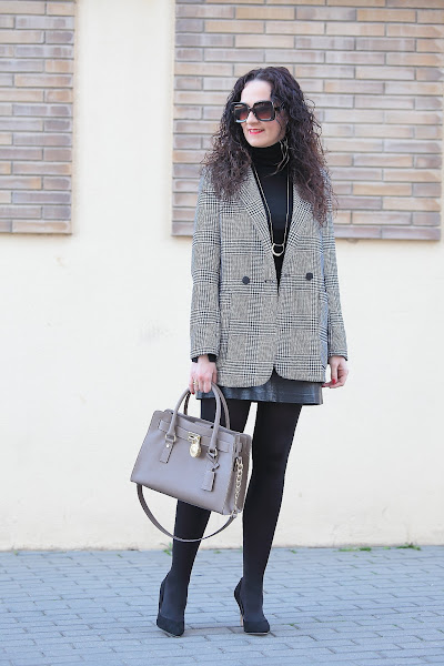 En invierno me vuelvo adicta a los jerséis de cuello vuelto. Sobre todo me encanta llevarlos en mis looks de oficina porque son calientes y me resultan muy versátiles a la hora de combinarlos. Hoy llevo uno básico en negro que he combinado con una blazer con estampado Príncipe de Gales y falda de polipiel negra. Sin quererlo he vuelto a caer con un total look negro, pero es que el combo que forma con la blazer me enamora.
