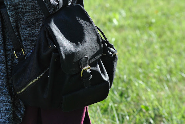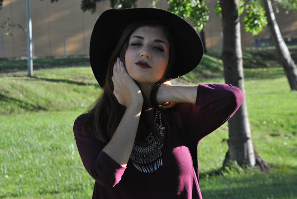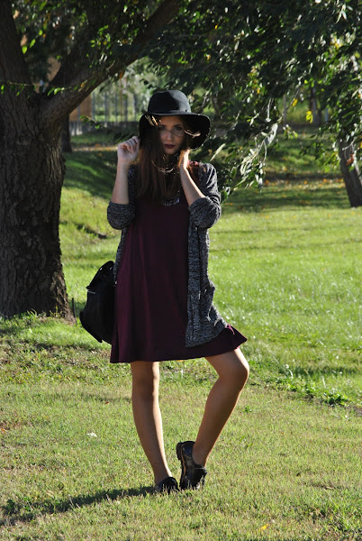 Para el outfit de hoy llevo un vestido tipo camiseta de color borgoña, el cuál supe en el momento en el que lo vi con qué quería llevarlo. Cárdigan negro mezclado, fedoranegra, oxfords negros, mochila negra. Ninguna duda. Y a los minutos... vi el collar y supe que ya tenía el toque final. ¡Todo perfecto! Solo hacía falta probarlo y hacer fotos...