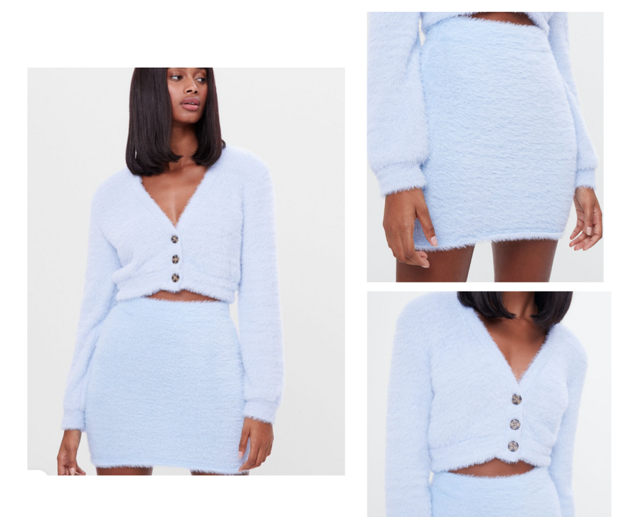 Quizás un look algo más juvenil: un set de dos piezas compuesto por una chaquetilla corta con botones y falda mini. Las dos prendas de pelo lo que hace que sean calentitas y no nos hagan pasar frío. En cuanto al calzado queda estupendamente con unas zapatillas blancas.