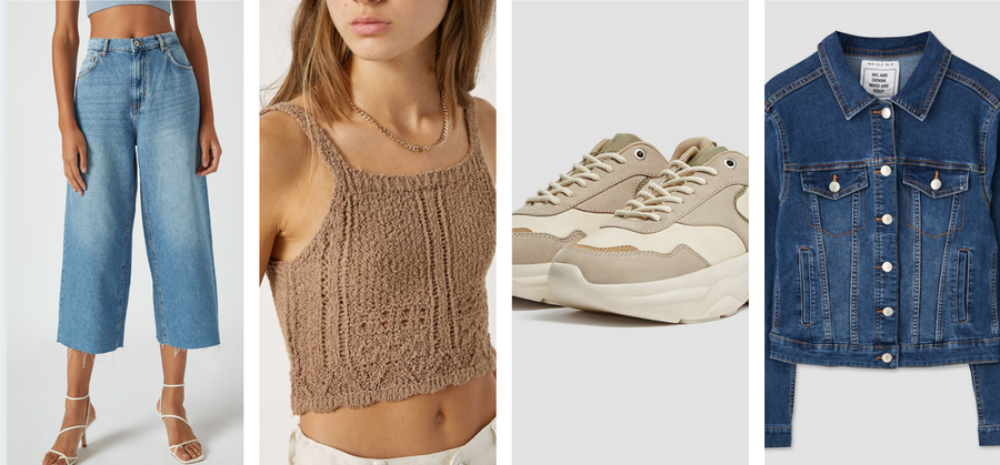 Mucho más casual, compuesto por unos jeans de corte recto, un top beige crochet, unas gambas en tonos grises y blancos que combinan perfectamente con el top, y por último una chaqueta vaquera, que nos salvará cuando empiece a refrescar un poco más a la caída del sol.