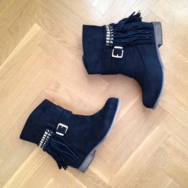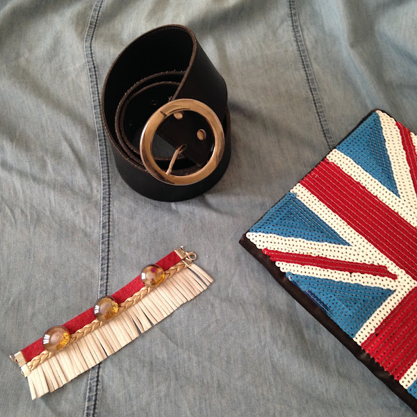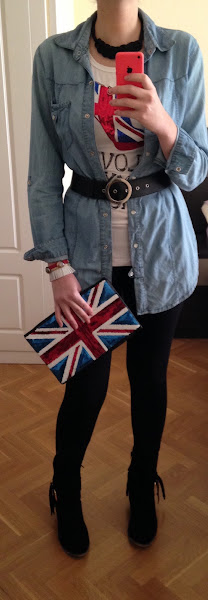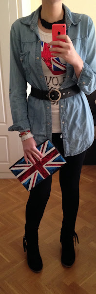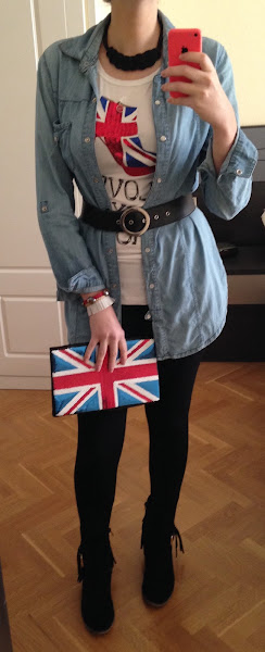 Hoy os enseño otro tipo de camisa vaquera que yo uso mucho como "chaqueta" en esta época, como podéis ver en la foto. En el look de hoy, predominan las lentejuelas con la bandera de Inglaterra, tanto en la camiseta como en el bolso y lo he combinado con un pantalón negro tipo legging con unos botos camperos (que estaba deseando estrenar). ¡Los botos son una monería! Me enamoré de ellos nada más verlos, y además con flecos que esta temporada se llevan muchísimo.