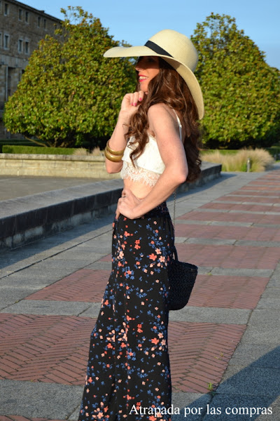En el look de hoy mezclo dos tendencias de esta temporada, por un lado los pantalones palazzo que podemos encontrar en multitud de estampados y por otro el crop top, en este caso un crop top de encaje de CHICUU, el encaje, sobre todo blanco, es uno de los tejidos estrella de esta primavera/verano 2016, y aporta a nuestros looks cierto toque de sensualidad, delicadeza y romanticismo, no debe faltar una prenda de encaje en nuestro armario este verano. Un look glam y a la vez sesentero al que le añadí unas cuñas bastante altas ya que el pantalón palazzo, si no eres muy alta como es mi caso, requiere de un calzado con tacón para crear el efecto de estilizar las piernas, un mini capazo negro y una pamela de rafia. Qué os parece el look?