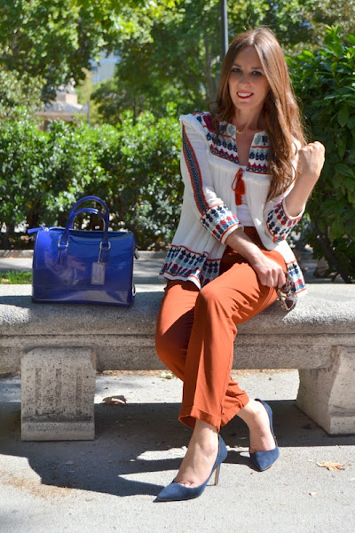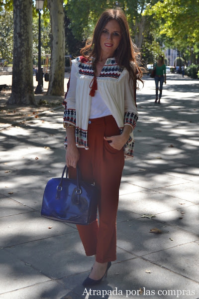 Hoy os enseño uno de mis looks durante los días que estuve por Madrid, si me seguís por instagram o facebook ya me lo habéis visto y para los que no, es novedad.... No me suelo comprar prendas que estén super vistas, pero esta chaqueta boho de Zara es tan bonita que no me pude resistir, eso si, lo que tenía claro es que iba a intentar combinarla de forma distinta a lo que llevo visto hasta ahora, así que como lleva tono teja que es uno de los colores tendencia para este otoño/invierno decidí combinarla con un pantalón de ese mismo color, un pantalón fluido con pinzas y de estilo masculino que me parece que encajaba perfectamente con la chaqueta. Para los complementos opté por el azul marino. Qué os parece el look?