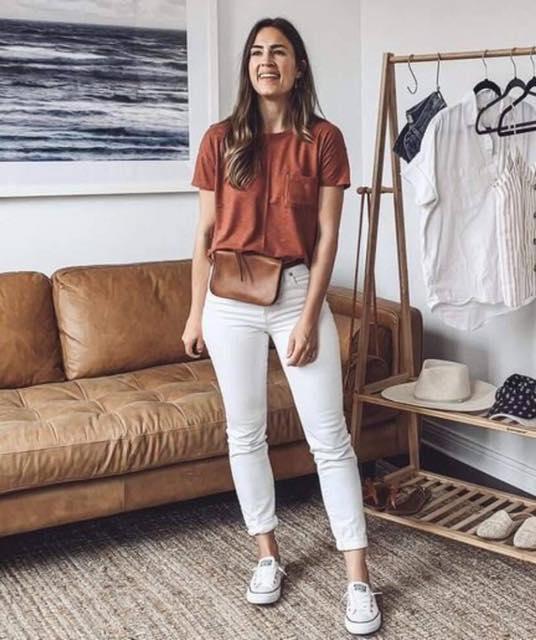Como te hemos diciendo desde el inicio del post, los jeans blancos se ven perfectos con todo así que aprovecha eso. Combina tus jeans favoritos con una camiseta de algodón con cualquier diseño.