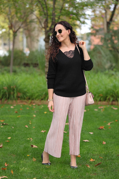 Para terminar la semana rescato estas fotos que tenía pendiente de mostraros por aquí. Pertenecen al otoño pasado y en ellas llevo un look que también estoy utilizando esta primavera, aunque tenemos días de mucho calor hay otros que te piden ir un poco más tapada. Llevo un jersey de pico al que le he combinado con un top lencero debajo y unos pantalones palazzo, me parecen tan bonitos que este verano les voy a dar mucho uso.