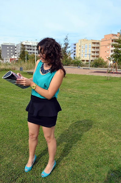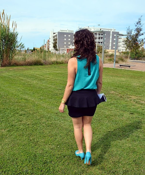 En esta ocasión me lo puse para salir un sábado. Como los colores del clutch son tonos grisáceos, turquesa suave y negro, quise mantener la armonía en todo el outfit y elegí esos mismos tonos para la ropa. La falda que llevo es de estilo péplum, este año ha pasado más desapercibida, pero es un estilo que me parece muy femenino y además estiliza un montón. La camiseta es una básica color turquesa de Stradivarius, este verano las habréis visto en infinidad de colores. Y como no, mis adorados peep toes. Ya os he dicho un montón de veces que estos zapatos son comodísimos! Los puedo llevar toda la noche y es como andar descalza.