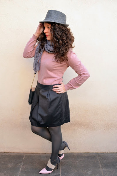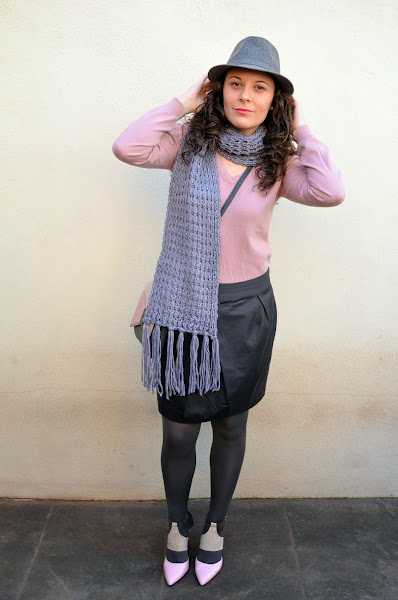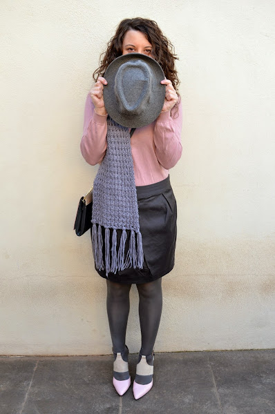 Por fin es viernes! Qué ganas tenía de que llegara este día, esta semana ha sido muy intensa y larga, he tenido mucho trabajo y ya habéis visto que no he podido actualizar todos los días. Hoy vengo con otro look y os enseño más cositas que me compré en rebajas y que ya os mostré en su día aquí y aquí . Se trata de este conjunto de zapatos y bolso en tonos pastel, concretamente en rosado, beige y gris. Me parece una combinación de colores muy dulce y práctica para looks de invierno como de primavera. En este caso yo opté por seguir en la linea de los colores del look. Llevo falda gris de estilo globo en la parte delantera y jersey de punto en rosa. Como sigue haciendo fresco cogí mi maxibufamda de lana gris y el borsalino. También os quiero mostrar otro outfit diferente con estos complementos. Podéis ver la propuesta de Teresa al final del post y no os olvidéis de pasar por su blog "Lo que sale de mi armario" para ver el look al detalle.
