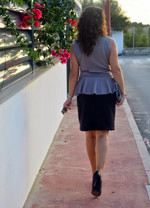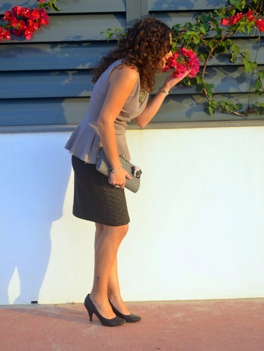 ¿Os gusta el estilo peplum? A mi me encanta, me parece un diseño muy femenino, pues realza nuestra figura ya que hace énfasis en la cintura y acentúa más las curvas de nuestro cuerpo. En este caso combino una falda de tubo negra con detalle delantero de piel con un cuerpo gris de estilo peplum con collar incrustado. Este look es perfecto para ir a la oficina, colores neutros y formales. Ahora ya debemos ir con una chaqueta porque por las mañanas refresca un poco, y lo ideal sería acompañar este outfit con una blazer negra. ¿Qué opináis de este look?