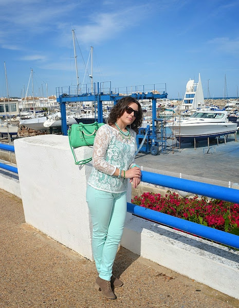 Respeto al look que llevé, sin duda busqué la comodidad pero con un toque chic. Fue sin duda un look muy primaveral y en verde. Elegí unos pantalones en tono verde pastel y una camisa de encaje en color crudo. Debajo de la camisa de encaje opté por una básica de tirantes en color verde, no sé vosotras, pero yo le saco mucho partido a estas camisetas, ya que le cambio la camisa que me pongo debajo y ya parece otra cosa. Respeto a los complementos os voy a contar un secreto jeje. El bolso de color manzana fue un chollo, me costó 10 euros en una parada del mercadillo de restos de tienda. Es una preciosidad ¿no creéis?. El collar de cuentas con flores de piedras tipo cristal y el reloj agua marina son de Trendy Accessories.