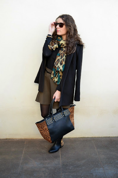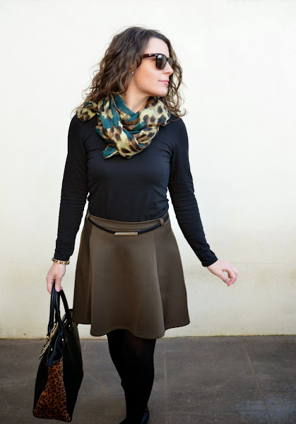 A principio del otoño muchos decían que el caqui era el nuevo negro, lo tachaban ya como la estrella de la temporada, aunque he de decir que creo que el burgundy le ha ganado terreno. A medias entre el color propio de los militares o el de un safari urbanita, se declaraba como un acierto seguro tanto para looks diarios como nocturnos. En el look de hoy la protagonista es la falda de neopreno en color caqui, sin duda una de mis mejores compras rebajiles. En este caso la he combinado con una camiseta básica en negro y con complementos en animal print que le dan mucho juego al outfit. Ya os digo que este no será el primer look en el que me veréis con esta falda, seguro que en primavera le saco mucho partido con una blusa o camiseta y con mi trench. ¿Qué opináis del verde caqui? ¿Os gusta?