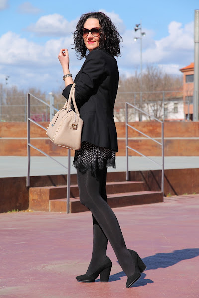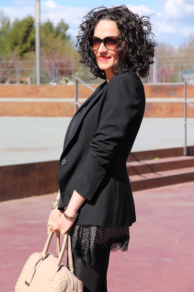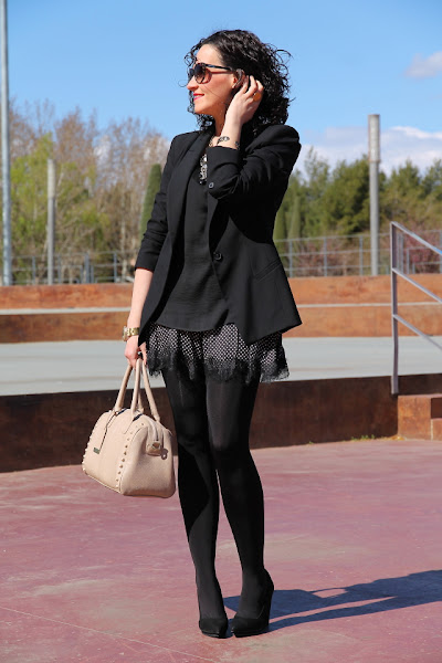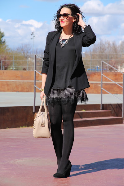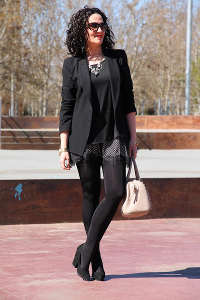 Amor a primera vista es lo que sentí por estos shorts lenceros, nada más verlos ya me los podía imaginar con diferentes combinaciones. Hoy os muestro la primera con ellos, un total look negro que deja todo el protagonismo a los shorts y que resaltan con el estampado de topos nude que tienen. Es una pena que el aire no los deje ver bien, la verdad es que tienen una caída preciosa.