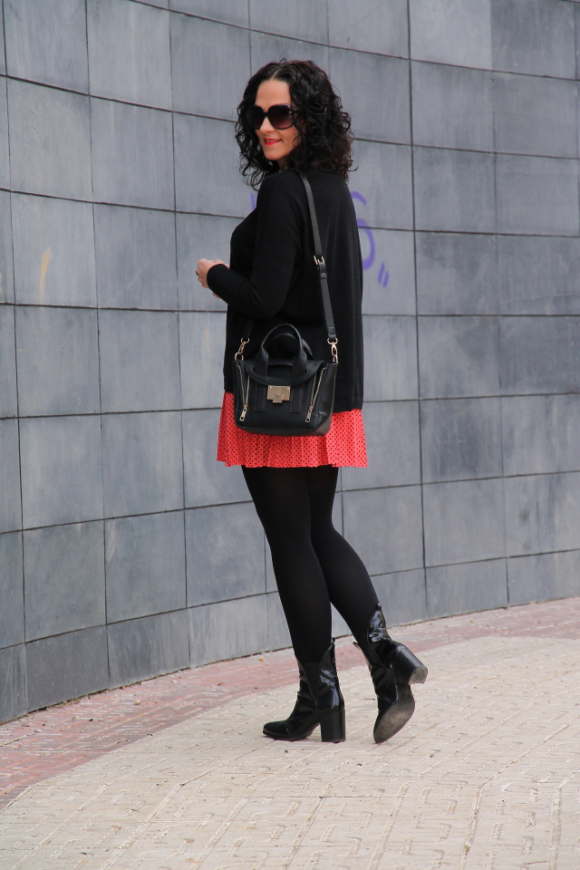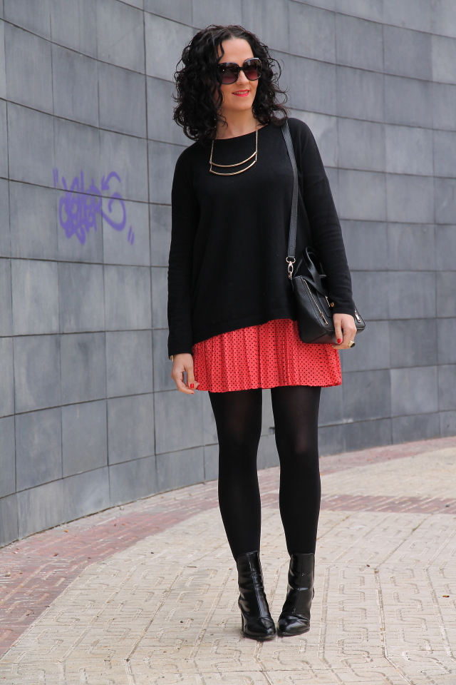 Y volvemos a los topos en el look de hoy, aunque esta vez en forma de falda. Nada más verla me gustó por la combinación de colores rojo coral y negro, además la textura con el toque del plisado le queda genial. Os la enseño en un look que llevé hace unos días para ir a trabajar con jersey oversize negro y mis botines favoritos. El punto final lo he dado con los complementos gracias al collar y el anillo dorados que rompen con la uniformidad de colores.