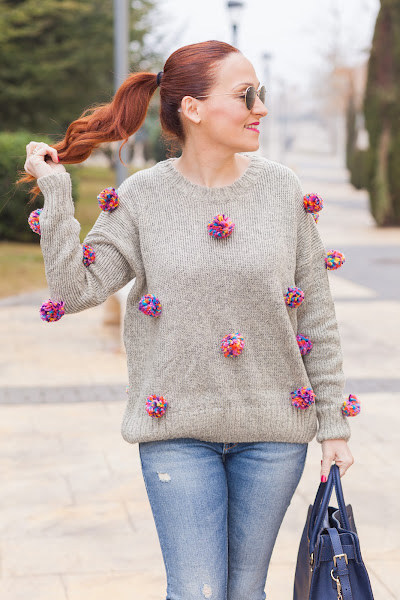 ¿No os parecen una monada los jerséis de pompones?, son tan originales que a mi me tienen conquistada. Esta temporada me he comprado dos, uno en tonos gris y negro de Zara Kids y este que os enseño hoy en un outfit relajado con jeans y zapatillas rosas.