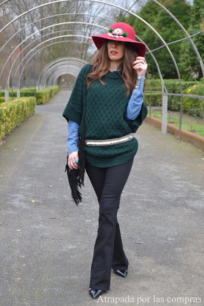 No es la primera vez que os enseño un look con poncho y es que esta prenda, a parte de ser tendencia, me parece super estilosa, ideal tanto para llevar como prenda de abrigo o como si se tratara de un jersey y sobre todo perfecta para esos looks de estilo bohemio que tanto me gustan. Hoy vuelvo a optar por crear un look boho pero esta vez combino un poncho verde de EL BAUL DE SHIVA con un pantalón de campana negro y una camisa vaquera. El toque más boho lo aportan los complementos, un bolso de flecos, un cinturón de monedas, algo de bisutería boho y un sombrero de LA SANTA que se lleva todas las miradas. Qué os parece el look?