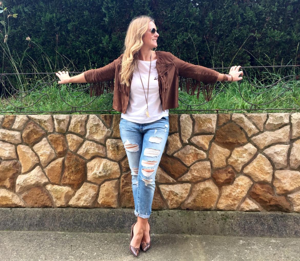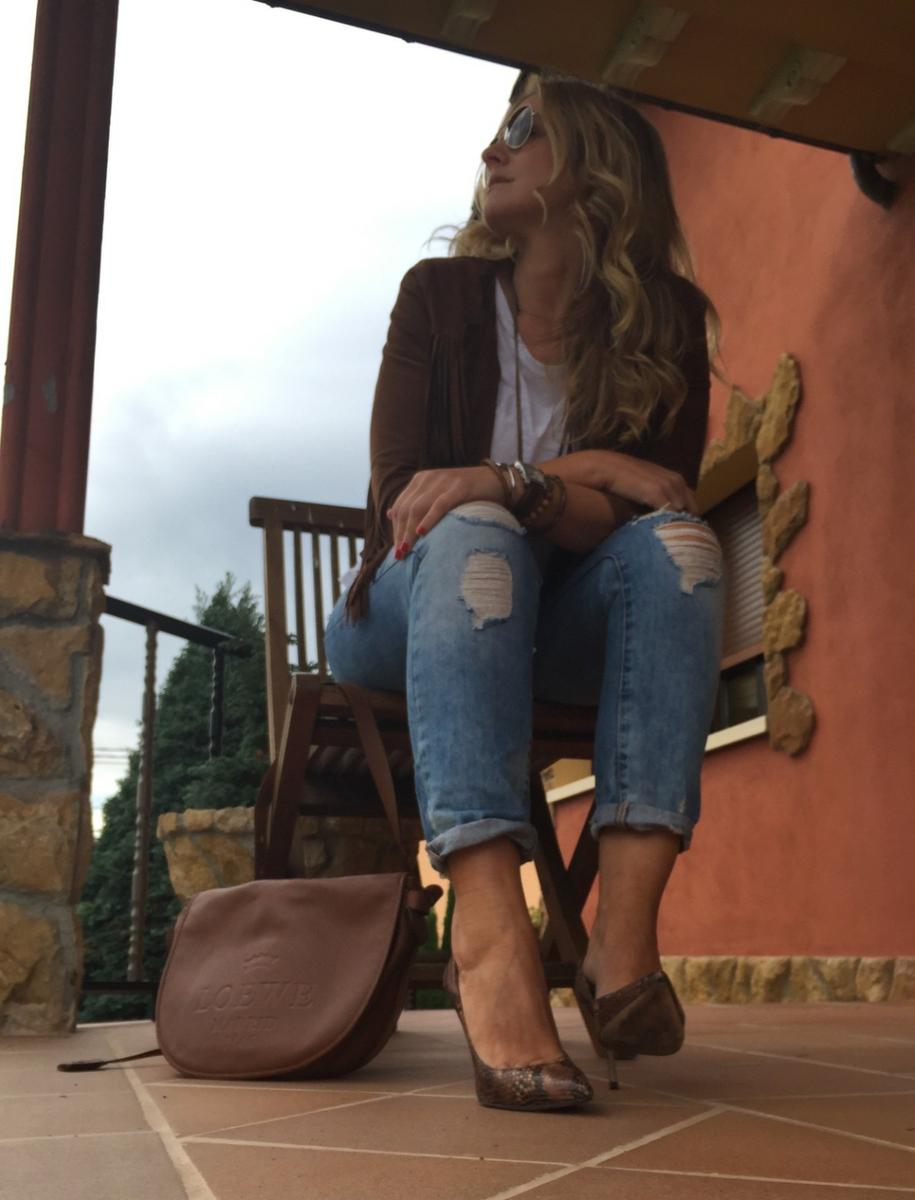 Para ello nuestra “TrendyTraveller” los ha combinado con una chaqueta de ante con flecos súper tendencia ya que los flecos han llegado pisando fuerte y parece que para quedarse por lo menos esta temporada y quien sabe si la siguiente.
