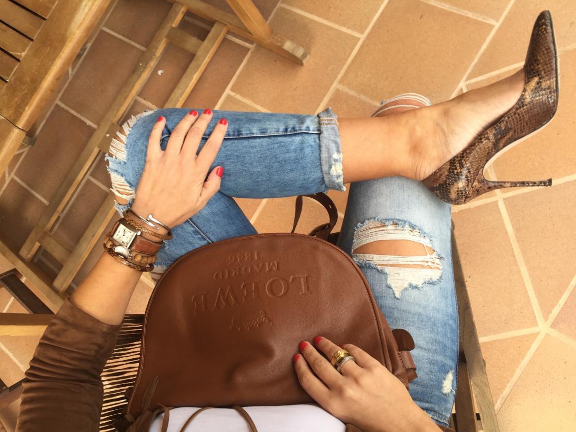 Y por supuesto no podíamos olvidarnos de los complementos: unos maravillosos “Stilettos” de piel de serpiente y el bolso Loewe.