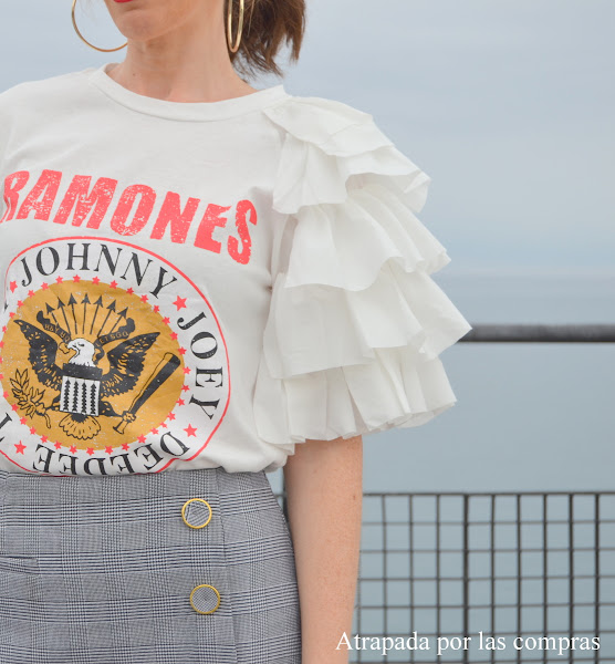 Seguimos con el estampado Príncipe de Gales, como os comentaba en el último look es, sin ninguna duda, el estampado tendencia de este otoño/invierno y son muchas las prendas en las que lo vamos a poder encontrar. En el look de hoy os enseño una minifalda Príncipe de Gales con botones laterales que combino con una camiseta de los Ramones con volantes en una de las mangas, un total look de ROCOCOA CANDÁS que acompaño con unos zapatos rojos y un bolso bandolera negro. Opté por recogerme el pelo en una coleta alta para dejar a la vista el detalle de los volantes de la camiseta y me atreví con unos pendientes de aro XL. Qué os parece el look?