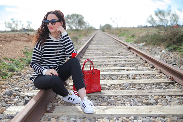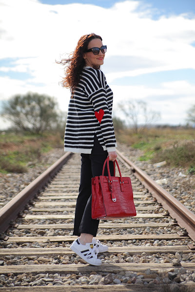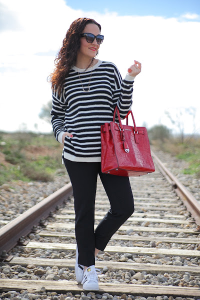 El estampado de rayas me gusta tanto que nunca puede faltar en mi armario. Además, soy tan fan de este estampado que no hay temporada que no acabe comprándome algo. Sin ir más lejos el jersey de rayas blancas y negras que llevo hoy es la última prenda que ha entrado en mi armario. El dibujo de los corazones rojos que lleva en los codos me conquistó totalmente, además de ser muy original el toque de rojo queda genial combinado con el blanco y negro. Lo llevo con unos pantalones de pinzas tobilleros, mis queridas Adidas Superstar y para cerrar un look sporty chic le he añadido mi bolso rojo de Michael Kors.