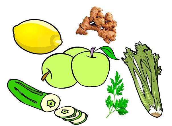 Ingredientes: 5 cm de apio, 1 pepino, el zumo de un limón, una cucharada de postre de jengibre rallado, un bol de espinacas frescas, 3 manzanas y una cucharada sopera de perejil fresco picado. Limpiamos todos los vegetales y los pasamos por la licuadora con un poco de agua, si nos queda muy denso deberemos utilizar después un colador o el chino. El zumo de limón y gengibre se puede añadir al final, el nivel de dulzor dependerá del tipo de manzana elegida.