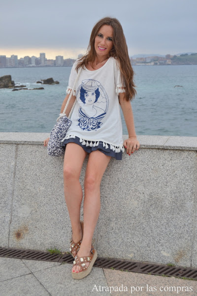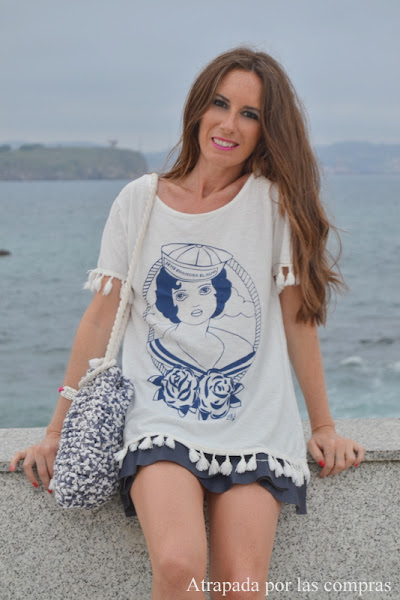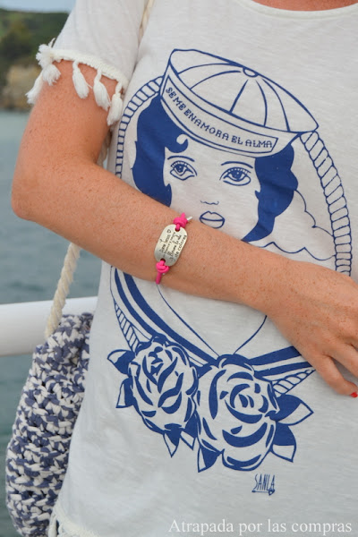 Qué poquito queda de verano, así que hay que ir apurando los looks de esta época que a mi tanto me gusta y que tan poco nos dura por el norte. El look de hoy, con cierto aire marinero, viene cargado de mensajes positivos y muy romanticones, por un lado una camiseta de SANLA con una frase que me encanta "Se me enamora el alma", y por otro una pulsera de UN POQUITO DE MI "Dame besos en blanco y negro y lléname la vida de colores". Remato el look con mis inseparables sandalias joya y un bolso bombonera azul y blanco de TORMENTA que ya os había enseñado en otro look.