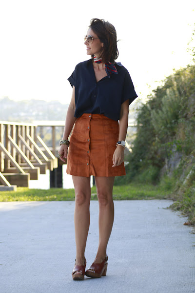 De vuelta con los pantalones y las faldas de tiro alto, las plataformas, el ante marrón... y sí, aquí le veo un "pero", al menos en mi caso: a poca "tripilla" que tengas, se marca mucho. Esta falda me parece que no marca tanto, pero los pantalones de tiro alto (que ya me he comprado dos) han hecho que me ponga a hacer abdominales como una loca!