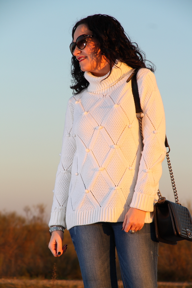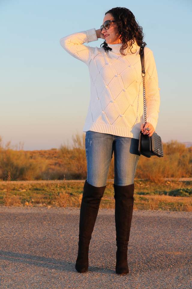 Si hace un año me hubieran dicho que me iba a poner botas mosqueteras no me lo habría creído. Ahora reconozco que me encantan, sobre todo con jeans como las llevo hoy. Este look con jersey de punto lo llevé un domingo para salir a dar una vuelta con mi marido, fui genial con él porque además de cómoda iba muy calentita, cosa que se agradece estos días que las temperaturas han bajado bastante.