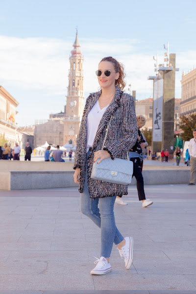 Los que me seguís desde hace tiempo ya sabéis lo que me gustan las prendas de tweed. Es un tejido que además de bonito se adapta genial a todo tipos de looks, por eso nunca tengo suficientes prendas de tweed. Hoy os enseño mi última compra, una chaqueta que combina tonos rojos, crudos y negros y que llevo en un look más formal pero al que tan solo cambiándole los zapatos de salón por unas Converse ...