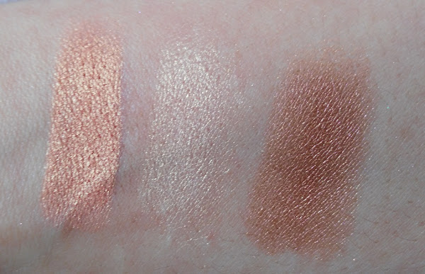 Lo bueno que tienen es que no son sombras polvorientas y se aplican y difuminan muy bien en los ojos. Para que podáis comprobar lo que os digo, os dejo a continuación unos swatches que hice con el dedo directamente sobre el brazo.