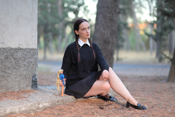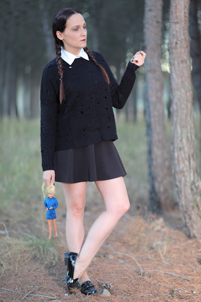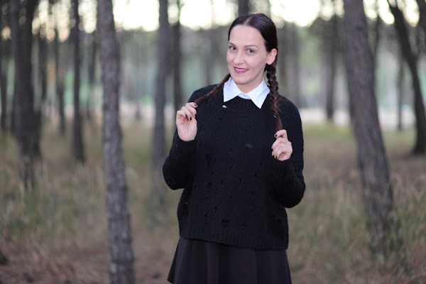 Halloween está a la vuelta de la esquina y gracias a los comercios ya empieza a sentirse en el ambiente. Así que he pensado que estaría bien dejaros una propuesta para hacer un disfraz rápido y fácil con prendas que tenemos en casa y reírnos un rato juntos. Supongo que ya habréis caído que voy de Miércoles Addams, un disfraz que no puede ser más fácil de hacer y que seguro podréis copiar porque tenéis prendas parecidas en vuestros armarios. Para ello yo he utilizado mi nuevo jersey de Shein que combiné con una camisa blanca, falda básica negra y mocasines. Recogí el pelo con dos trenzas, me maquillé simulando ojeras, pinté los labios oscuros y ¡voilà! un disfraz fácil, económico y sobre todo... muy terrorífico.