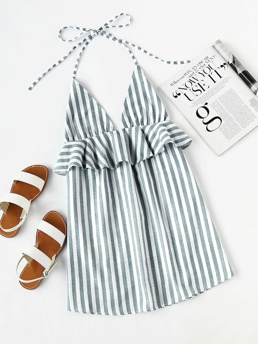 Y por último, este vestidito de rayas verticales con tirantas y volantes. ¡Es adorable!