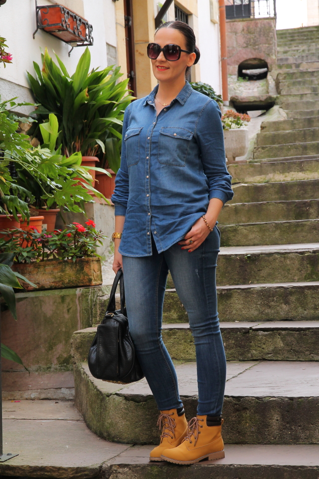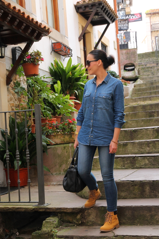 Ya os conté que durante mis últimas vacaciones, paseando por San Sebastian, encontré una zapatería con unas botas estilo Panama Jack o también llamadas botas Timberland por las que sentí un flechazo inmediato. Como siempre me pasa, no puedo aguantar mucho tiempo sin estrenar lo último que me he comprado, así que las estrené el día que nos dirigimos hacía Cantabria. El look lo monté entorno a ellas y como necesitaba sobre todo ir cómoda para hacer turismo opté por un total denim con camisa vaquera y jeans pitillo. Las fotos las hicimos en San Vicente de la Barquera, un típico pueblo de pescadores con un encanto especial en el que además comimos genial.