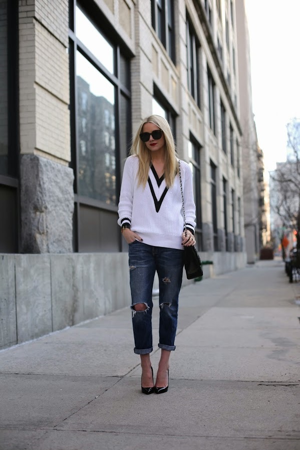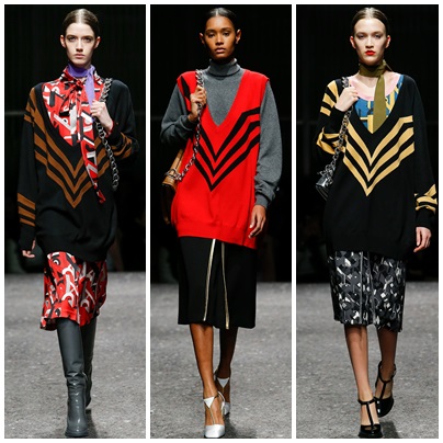 Este jersey, con escote en V y con ribete en bicolor tanto en puños como en escote, lo pudimos ver en los desfiles de Chanel en su colección Resort 2014, en las colecciones primavera/verano 2014 de Ralph Lauren y Rag & Bone y más recientemente en la colección de Prada para este otoño/invierno aunque en una versión un poco diferente.