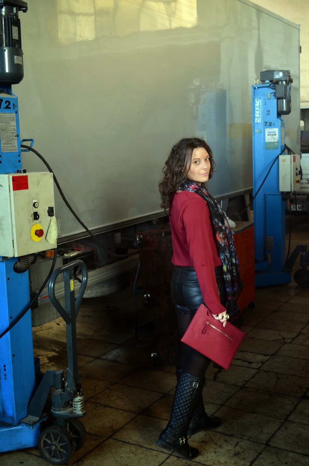 El outfit que elegí para la ocasión tenía que ir acuerdo al escenario. Ya sabéis que un taller está lleno de grasa y yo opté por un look con un toque desenfadado con shorts de cuero y botas altas. Para seguir con la tendencia de esta temporada me puse mi blusa de satén burgundy y el clutch en el mismo color.