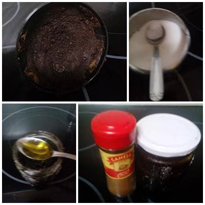 En un bol, echaremos los posos del café y los mezclaremos con el azúcar.Agregaremos el aceite de oliva y añadiremos una cucharadita de canela molida.