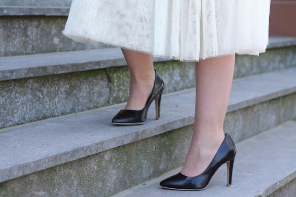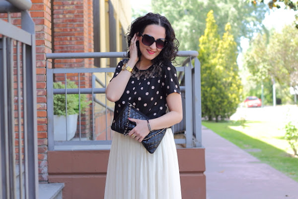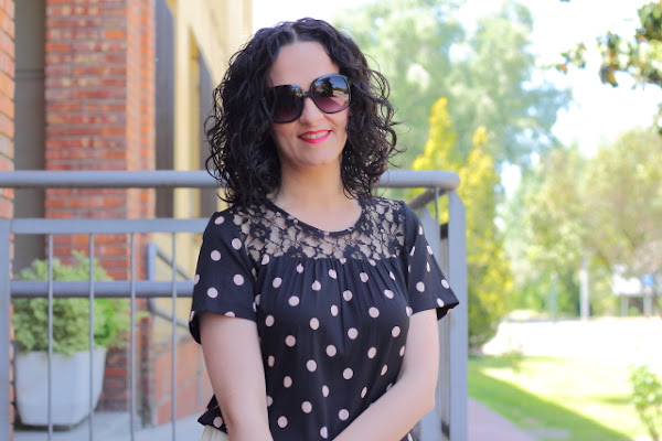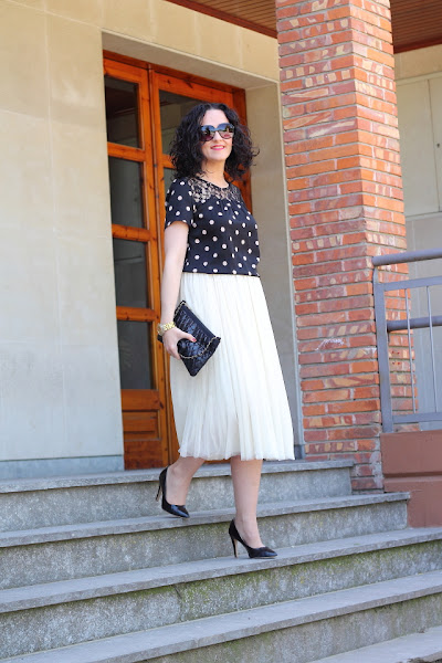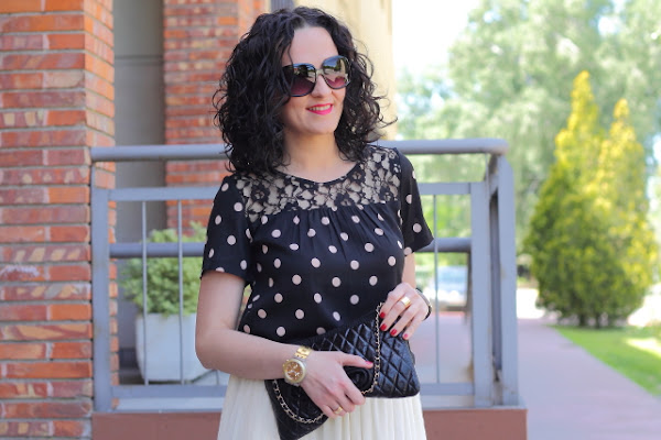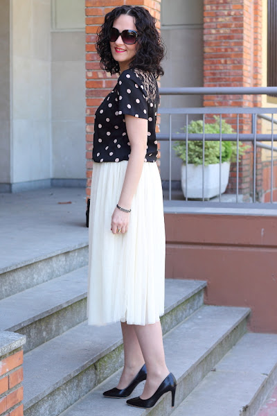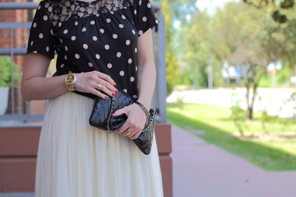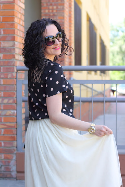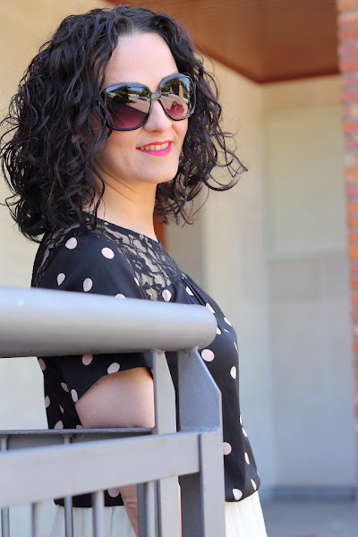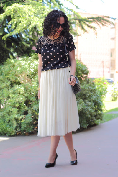 Me encantan las faldas de tul en todas sus formas, ya sean cortas, largas, voluminosas..., en definitiva me vuelven loca. Hace un tiempo os comenté aquí que tenía muchas ganas de hacerme con una y por fin la he conseguido, al tener ya una negra me he decantado por esta de corte midi en color beige. Este verano con camisetas de tirantes básicas y cuñas la voy a llevar muchísimo pero este día me apetecía un look más chic, así que la combiné con una blusa que combina dos cosas que me gustan mucho como son los topos y el encaje.