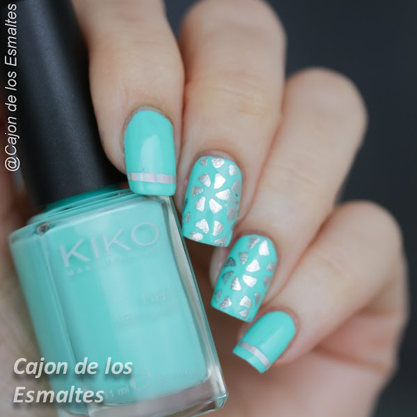 Comienza como siempre por una rutina de cuidado de uñas y pinta una capa solida de verde color menta en todas las uñas excepto en el dedo indice, pinta en ese dedo una color plata en los dedo indice, en los dedos vedes pinta una linea horizontal gruesa de color plata y con el pincel de detalle realiza lineas horizontales con un efecto de pintura corrida, sobre la uña color plata adorna con el top coat y listo.