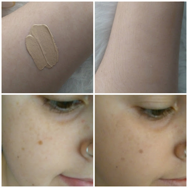 En las fotos de arriba se ve la textura que puede parecer super cubritiva, pero al esparcirla no cubre nada. Y en las fotos de abajo se ve como oscureció el color y no cubrió ninguna imperfecciòn.